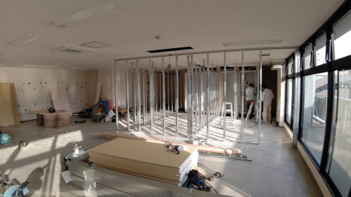 まずは間仕切りや受付カウンター、パウダールームの造作です。